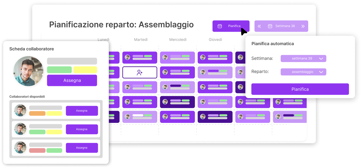 Associa automaticamente ogni persona disponibile, qualificata e senza limitazioni fisiche alla postazione di lavoro più adatta. Così garantisci una distribuzione efficiente e coerente delle risorse in stabilimento.