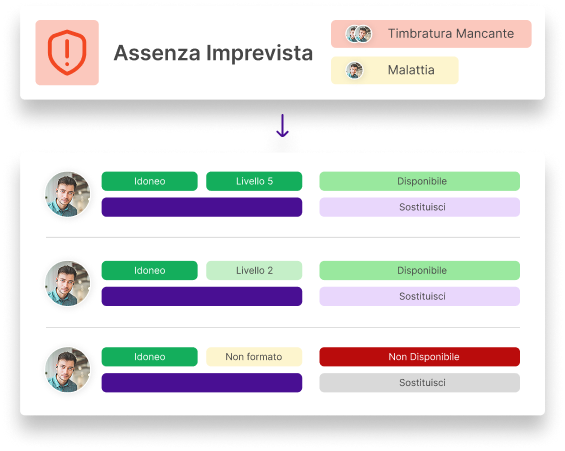 awm ti consente di gestire e consuntivare in tempo reale imprevisti e assenze dell’ultimo minuto, garantendo sempre le risorse migliori sul campo. Il sistema non solo segnala subito la mancanza di un operatore, ma propone anche il sostituto più adatto, con competenze equivalenti, così da ridurre al minimo i tempi di reazione.