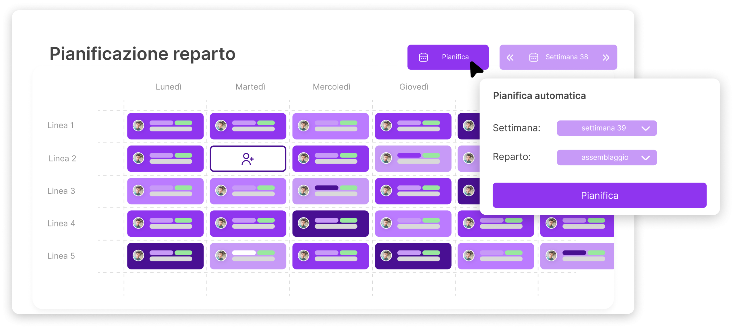 La piattaforma supporta l’intero processo di allocazione delle risorse integrandosi con i software di pianificazione a lungo termine, di generazione dei turni, di rendicontazione e di gestione dei payroll.
